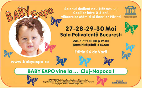 Parintii sunt invitati la BABY EXPO de Joi, 27 Mai pana Duminica, 30 Mai, zilnic intre orele 10.00 si 19.00, iar Duminica pana la ora 16.00, la Sala Polivalenta din Bucuresti.