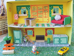 Apoi faceti un plan al modului in care se va desfasura lucrul. De exemplu: mai intai taiem ferestrele, apoi tapetam cu hartie peretii, apoi realizam mobilierul, iar la final desenam cu carioca peretii (un ceas, perdele, o biblioteca cu carti etc.).