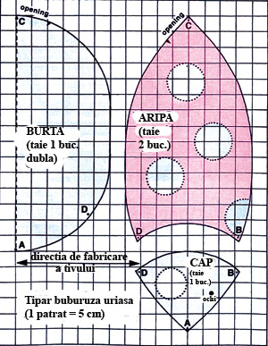 Marcheaza directia in care trebuie sa lasi cate 5 cm pentru tiv (vezi sageata de pe tipar). Foloseste-le ca pe tipare pentru a scoate piesele din materialele adecvate. Marcheaza cu litere, ca in schema, punctele A, B, C etc., care iti vor indica ulterior ce parte peste ce parte va fi montata.