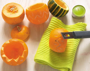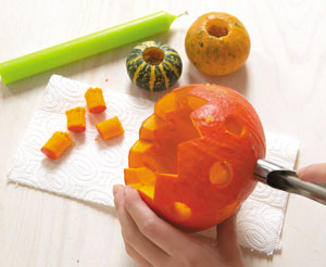 3. Atentie: nu face gaurile pentru ochi direct cu cuterul, pentru ca risti sa fisurezi coaja. Mai intai, foloseste instrumentul de scos samburii merelor pentru a face doua gauri rotunde si abia apoi continua cu cuterul, cioplind marginile. La fel poti face pentru gura si nas, indreptand apoi liniile.