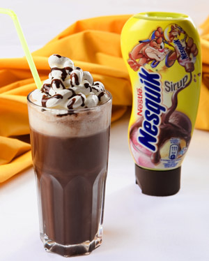 Ii mai trebuie putina inghetata, cateva cuburi de gheata si frisca. Deliciul final va fi siropul de ciocolata NESTLÉ Nesquik, pe care il va turna chiar el in pahar.