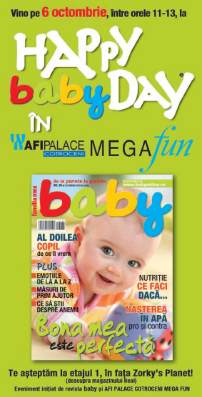 Te asteptam miercuri, 6 octombrie, incepand cu ora 11, la HAPPY baby DAY, in Afi Palace Cotroceni Mega Fun, la etajul 1, in fata Zorkys Planet (deasupra magazinului Real).